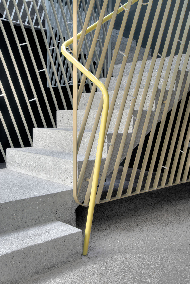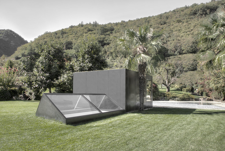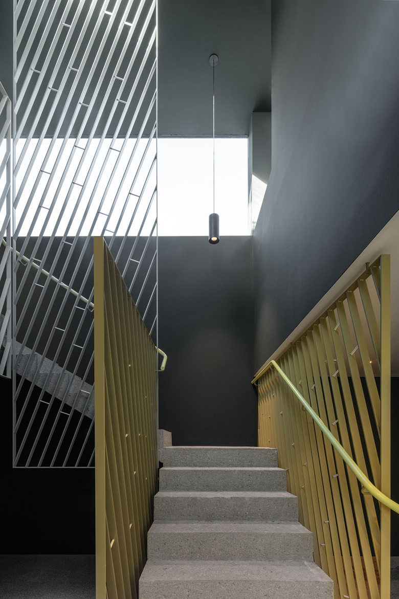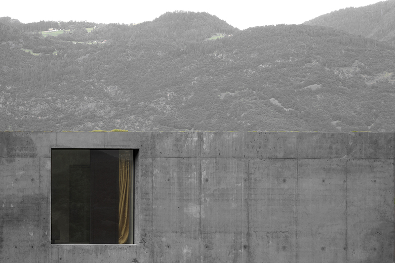 architecture as a symbol. a protruding wing in the entrance shows the way, a sweeping buckled roof of black concrete leads to the reception area on the inside, to the lounge, bar, and out to the landscape. the ceiling grid mirrors the new implants. an open floor plan with small boxes or dens provides an intimate atmosphere. in the landscape, a well-lit stairway serves as the link between the outdoor and indoor pools. the bronze monolith seemingly grows out of the ground, out of its depths, and at night becomes a light installation.