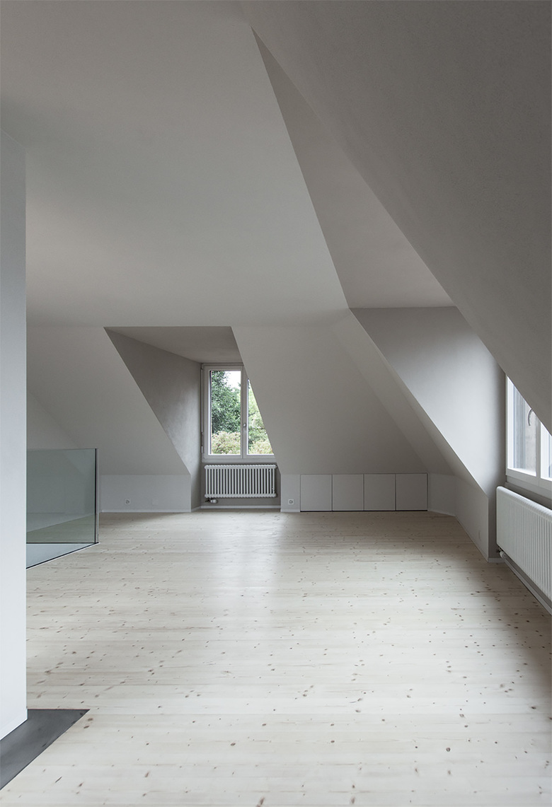 Die Eigentümer der drei Reihenhäuser an der Rebhügel- und an der Wiedingstrasse haben sich zusammengetan, um den Dachstock gesamthaft auszubauen. Unterschiedliche Voraussetzungen und Anforderungen haben in den drei Dachstöcken nach unterschiedlichen Ausbau-Entwürfen verlangt. Ein übergeordnetes Konzept soll dabei die grosse Form des gemeinsamen Walmdaches weiterhin beibehalten, ohne die Individualität der einzelnen Häuser zu vernachlässigen.