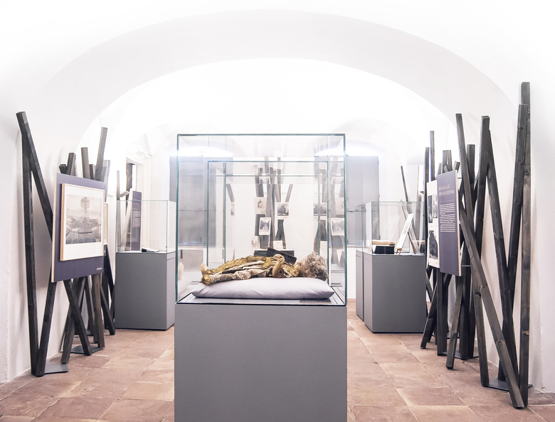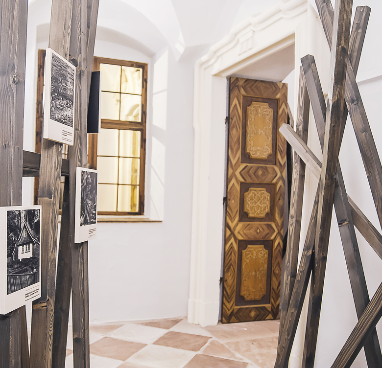 Kern des Gestaltungskonzeptes ist, diese signifikante Atmosphäre in die Schlossräume zu übertragen. Ein abstraktes Geäst aus dunklem Holz steht dabei als Sinnbild für die Eremitage-Architektur und deren abgelegenen Standort. Es ist ein bearbeiteter Werkstoff, eine Interpretation der „Natur-Architektur“, die sich zwar expressiv, aber dennoch frei und sensibel vor die historischen Wände des Schlosses legt und einen eigenen kontemplativen Kosmos bildet. Durch eine Lasur bleibt die Materialität des Holzes sichtbar und ist für die Besucher haptisch erfahrbar. Der farblich reduzierte, stilisierte Wald fungiert gleichzeitig als Träger für Texte, Abbildungen und Exponate in den denkmalgeschützten Räumen. Für sämtliche Trägerplatten wurde ebenfalls das Material Holz verwendet. Zwischen dunkelgrauen, vollflächig bedruckten Platten, bei denen die Maserung des Holzes durchschimmert und naturbelassenen wenig bedruckten Holzplatten entsteht ein spannendes Wechselspiel. Ein besonderes Augenmerk erzielen die ausgefrästen Schriften in den Texttafeln, die das haptisch sinnliche Raumerlebnis abrunden.