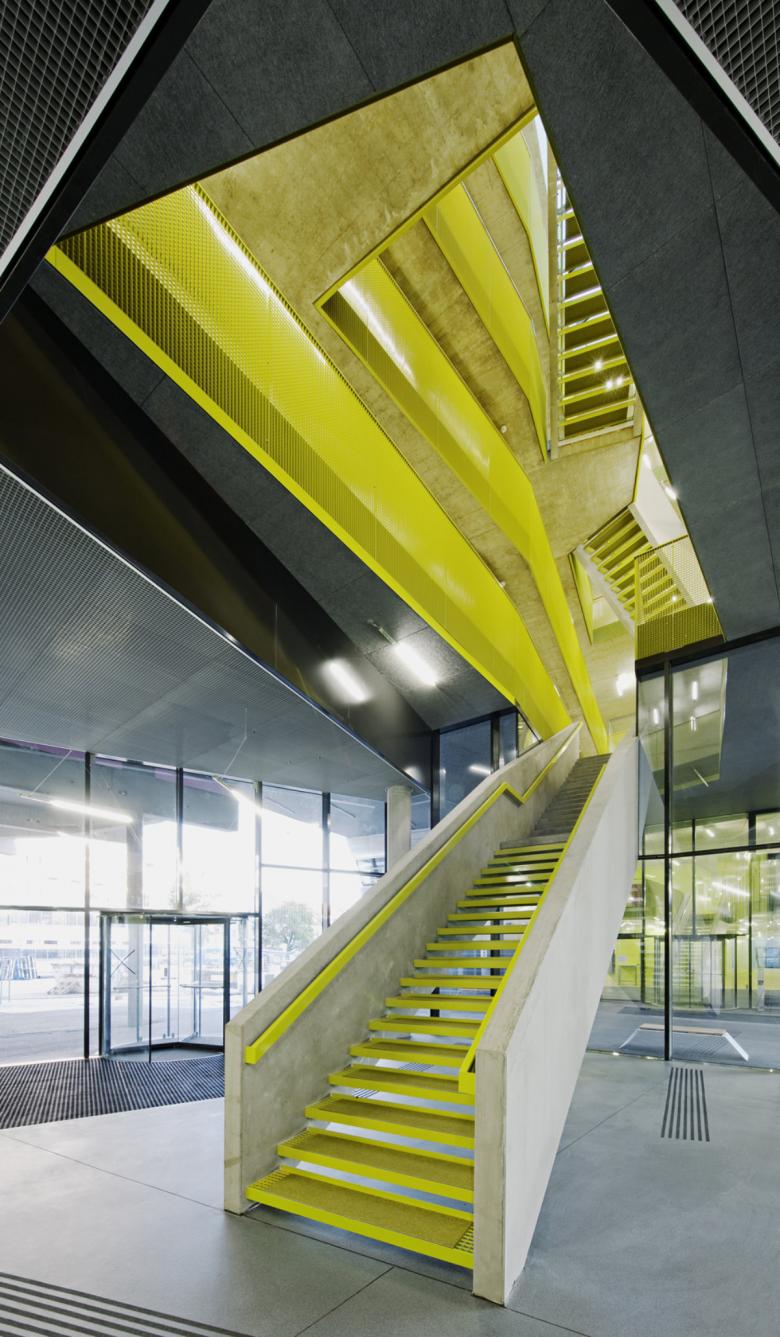 wie bei den vorgängerbauten wachsen aus dem sockel zwei parallele riegel empor, die auf 6 geschossen büros und labore beherbergen.