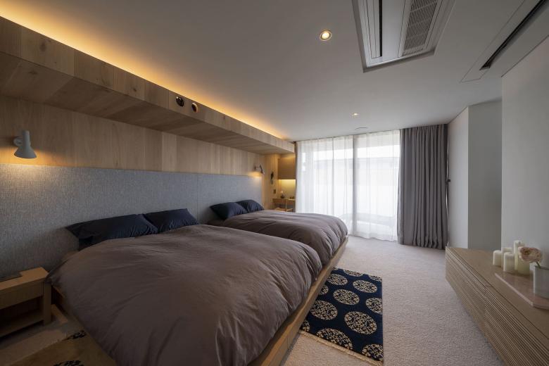 客室は中庭の軒天に正円に抜き取られた空を中心とした双子の和室。お互いを借景としあうこの双子はそれぞれに静謐な世界観と奥行をもたらしあって存在している。