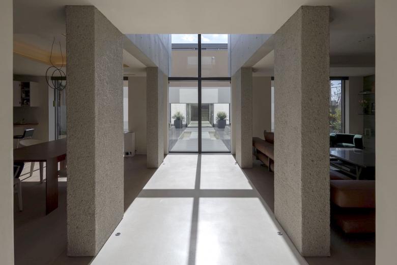 1Fにあがると、コンクリート小叩きでつくった4本の柱を中心に、両脇にリビングとダイニングを抱えたシンプルでシンメトリックな平面となっており、中央にまっすぐ外まで貫く一本の道、そしてそこに突き立てられた吹き抜け2層分の逆十字型のフレームを持つ開口部は、建物を全体をまとめあげる象徴的な意味をもつ。