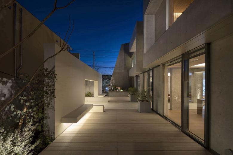玄関で最初に目に飛び込んでくる階段は巨匠カルロ・スカルパからインスピレーションをうけ、複雑な立体をコンクリートでつくるという挑戦であり、石灰岩モルタルを研ぎだして仕上げ、階段そのものがアートとなることを目指した。