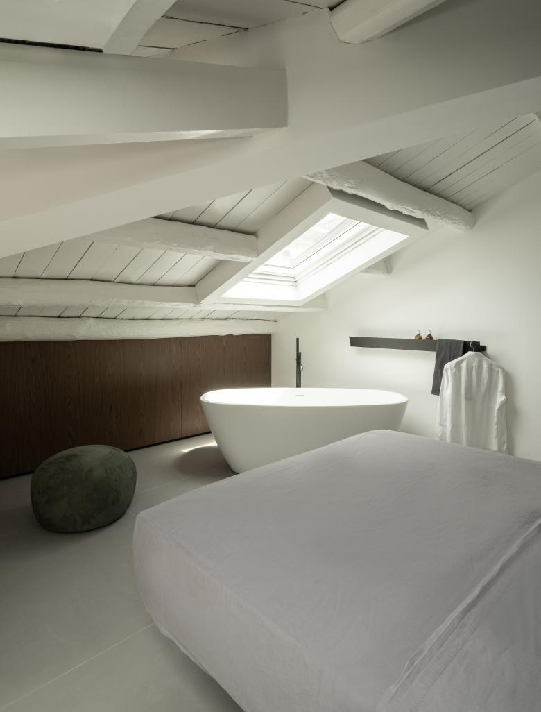 La zona notte è il cuore della casa e viene collocata nella mansarda che gode di una doppia luce zenitale. Qui è stato necessario lavorare in sezione per poter garantire una corretta fruizione degli spazi: All’interno della stanza viene inserito un volume dalla forma trapezoidale che asseconda l’andamento del tetto e contiene il bagno, ai suoi due lati si innestano la zona lavabo, con un pezzo unico su disegno in marmo di Carrara mentre sull’altro, il più basso, trovo posto un piccolo guardaroba a giorno. Il letto, sospeso, affianca il nuovo volume che funge da testata mentre una vasca free standing viene collocata ai suoi piedi, in perfetta corrispondenza della finestra sul tetto.