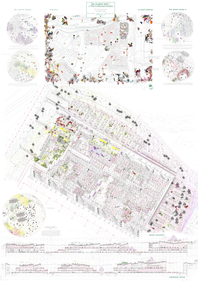 "The project reformulates the concept of mall, based on an understanding of it as a kind of landscape. A landscape that has clear compositional rules, seeking a targeted routes, spaces of surprise, chasing catch the visitor. Then two natures are faced to each other, the garden and the mall, and a third mixed space appears when they touch, the Burrow."