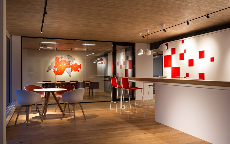 Die neuen Räumlichkeiten der Delta Logic AG in Sursee zeigen das Corporate Design von Tribuna in räumlicher Form. Die roten Quadrate des Logos erscheinen auf einer raumprägenden Wand hinter dem Empfang in abgewandelter Form und sind in Filz umgesetzt. Der Empfangskorpus geht in einen Bartisch über und der funktionale Kern der Räumlichkeiten, der Sanitärräume, Technik und Schränke verbirgt, ist komplett in Stoffpaneele gekleidet, die zudem auch die Akustik verbessern. Generell gibt die Gestaltung mit viel Holz, Stoff und warmer Beleuchtung den Büroräumen, dem Empfang und dem Besprechungsraum einen sehr attraktiven wohnlichen Charakter.