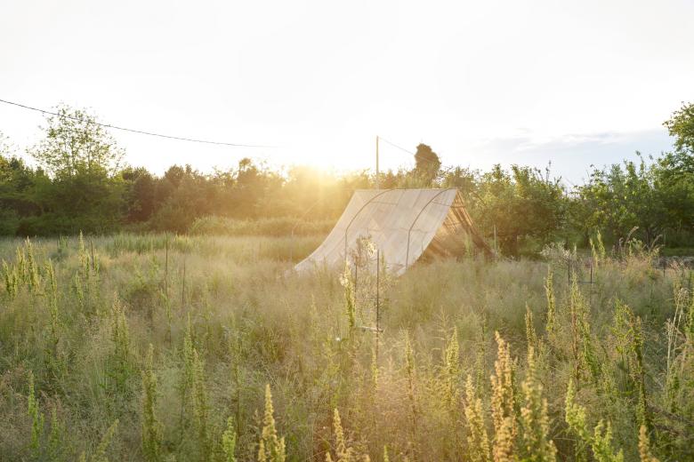 The site was selected within the fields of the only organic farm on the island, whose owner took part both in the construction process and in the activities hosted afterwards in the structure.