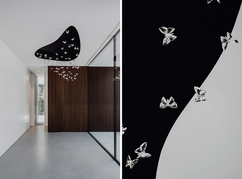 Die Fassadenverkleidung mit den eleganten Holzlamellen läuft scheinbar durch das gläserne Eingangselement des Foyers. Durch die Fortführung der warmen Holzvertäfelung im Innern des Hauses entsteht ein fließender Übergang zwischen Innen und Außen. Schon ein erster Rundumblick stellt klar, dass die Innenarchitektur von Haus von Osee geprägt ist von wenigen ausgewählten Materialien und Farben mit denen das gesamte Gebäude auf zeitlose Art und Weise bespielt wird. Sichtbeton und Holz, schwarz und weiß bilden einen perfekten Hintergrund für das erste Highlight: Eine aus Swarovski-Kristall-Schmetterlingen von Philipp Architekten entworfene Leuchte, die wie ein moderner Lüster unter einem, im Stil der fünfziger Jahre, nierenförmigen schwarzen Deckenausschnitt hängt.