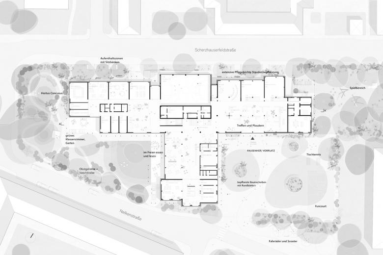 Wichtiger Grundgedanke des Entwurfes war es, möglichst gleichberechtigt hohe Qualitäten für alle Lernhäuser zu schaffen. Alle Lernhäuser sind 3-seitig belichtet, organisieren sich rund um den zentralen Marktplatz und bieten gute Übersicht für die Pädagoginnen und Pädagogen. Alle Lernhäuser sind als organisatorisch geschlossene Einheiten konzipiert. Die Marktplätze stellen die jeweilige Mitte der Lernhäuser dar. Sie sind direkt an die Freibereich angebunden und verfügen über direkte Belichtung und Belüftung.