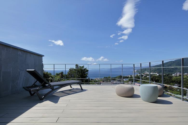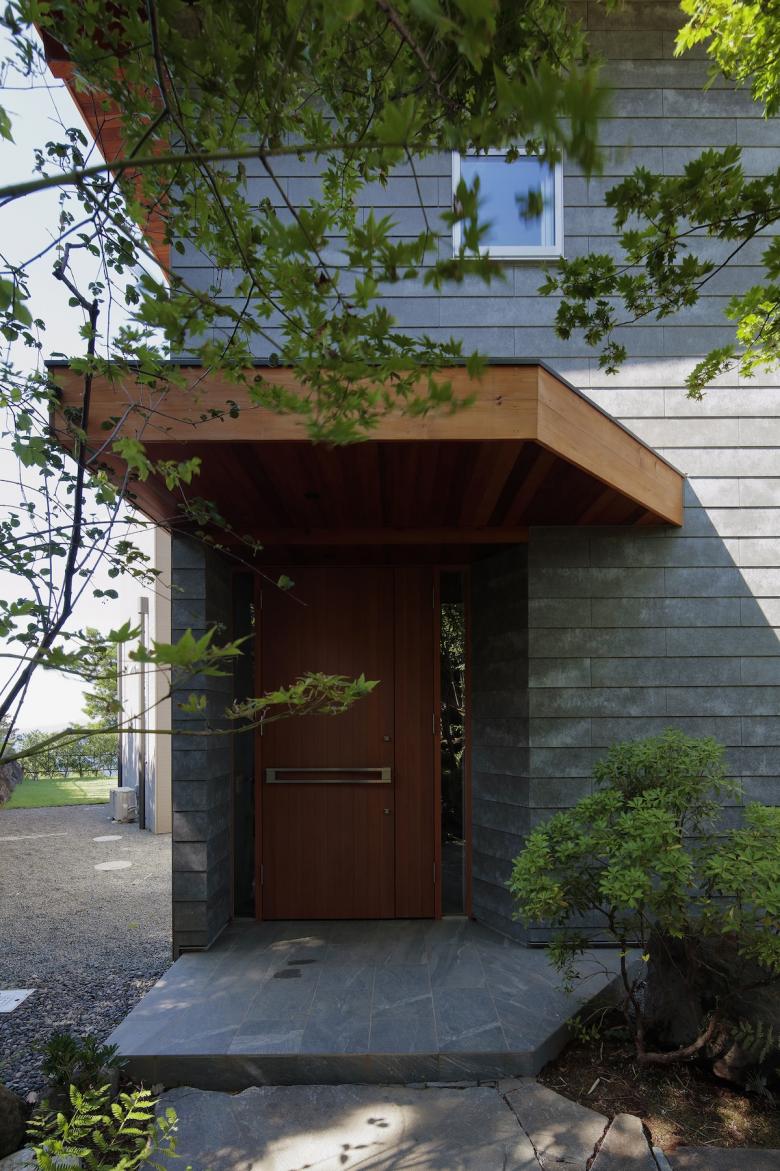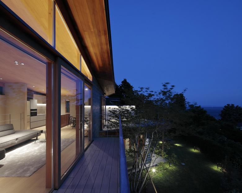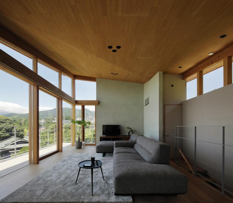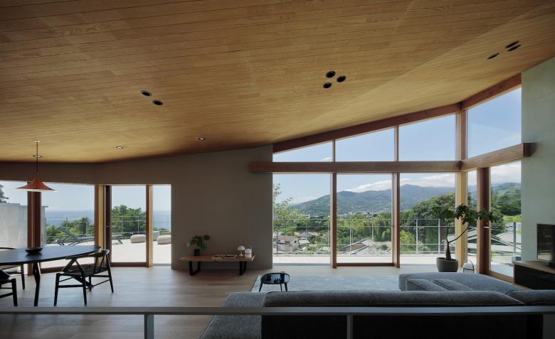敷地からは海と山、両方のパノラマビューが広がる。しかしあえて各部屋の用途の特徴(書斎などの集中することのできる空間や、寝室などのプライバシーの高い安心できる空間など)に合わせて窓からの景色をコントロールすることを試みた。2階のLDKやテラスは海や半島から山々の稜線が一緒に見える景色が視界に広がり、その景色の中に浮いているように感じられ、書斎からは植栽や庭石によって近い景色の向こうに遠い景色があることで落ち着いて集中しながら考えに耽ることのできる景色を作った。