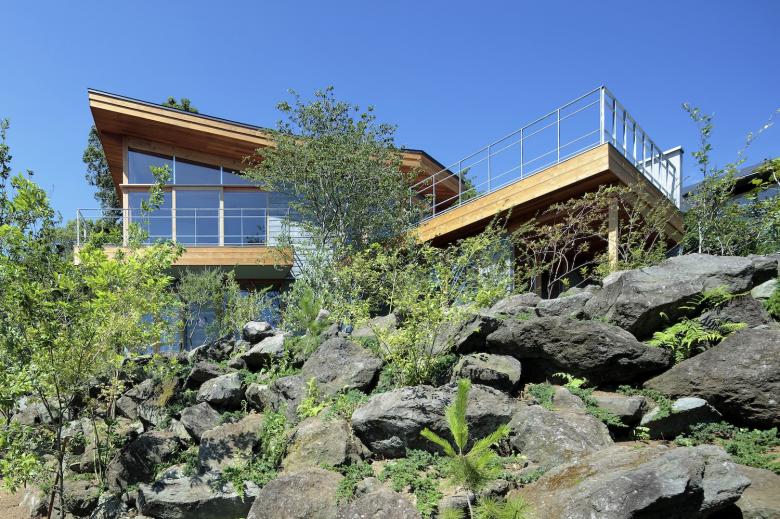 建物は景色に馴染むよう自然素材である木と自然な風合いを持った素材を採用。また敷地の下に広がる斜面には地元で産出する小松石を土留に採用し、岩の間に様々な植物を配置して建物と一体となった風景を作り出している。斜面の中腹に空に向かって風になびくように広げた屋根、威圧感無く自然に溶け込み建つ姿を目指した。