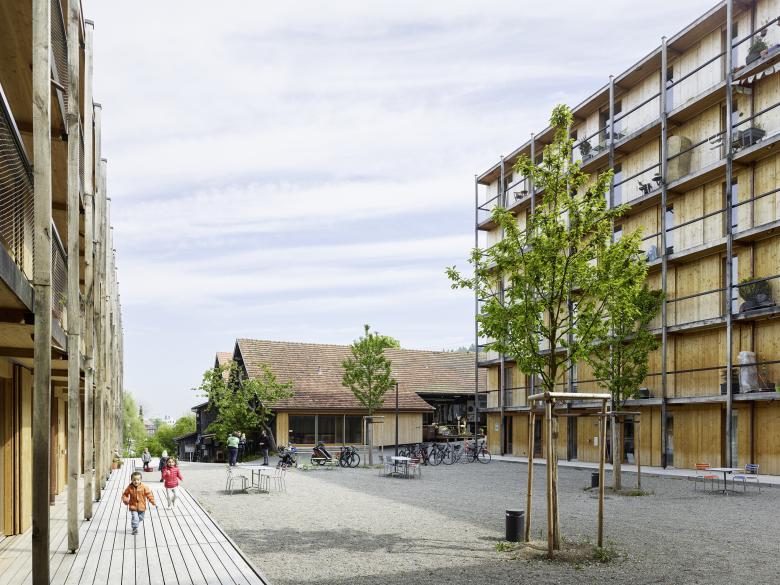 Der Projektperimeter befindet sich in Winterthur Seen und liegt in unmittelbarer Nähe des Bahnhofs. Es ist nun die Absicht, auf den Grundstücken in 2 Etappen ca. 120 Mietwohnungen zu realisieren. Die Topographie prägt das Areal wesentlich. In der Diagonalen gemessen ergeben sich Höhendifferenzen von ca. 13 Metern. Das Areal kann in 3 Bereiche unterteilt werden: einen höherliegenden Bereich im Südosten mit den bestehenden Gebäuden, ein nach Nordwesten abfallender Hang und ein tieferliegender Bereich an der Grundstrasse. Mit den neu zu planenden Wohngebäuden soll der abfallende Hang weiterhin als Freiraum erhalten bleiben. Hofgebäude (1.Etappe): Zusammen mit der Scheune wird ein neues Ensemble gebildet. Diese neue Gesamtfigur windet sich um einen zentralen Hof, der bewusst als dichter, räumlich klar gefasster Raum ausgebildet wird. Das Gebäude beginnt im Westen 3-geschossig, nimmt im Südflügel um 1 Geschoss zu und endet an der Arbergstrasse als 5-geschossiges Gebäude. Durch die Höhenstaffelung reagiert es angemessen auf die unterschiedlichen Nachbarschaften. Die unterschiedlichen Wohnungsgrössen werden im U-förmigen Gebäudekörper frei verteilt und tragen so zu einer guten Durchmischung bei. Die meisten Wohnungen profitieren von einem privaten Aussenzimmer und einer Verandaschicht zum Hof hin.