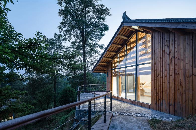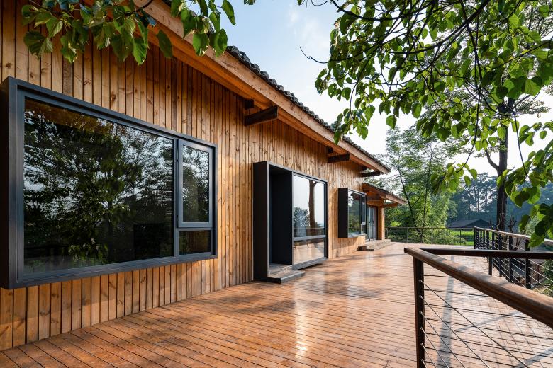The wall adopts a brick-concrete structure, which is only used as an envelope system -- does not participate in the load-bearing of the roof. Appropriate introduction of industrialized system, including industrialized wood as the structure of the entrance hall, steel structure to make corner windows of suites, and steel plates to produce door and window covers in batches ,and so much more, adds modern elements to the wood structure building. The facade panels use anticorrosive wooden slats in order to respond to the slatted exterior walls of traditional houses.