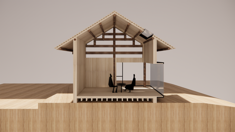 The preserved wooden structure is made by local carpenters in traditional ways. After removing the wooden wall and roof of the old house, the old wooden frame was jacked up and moved to the adjacent open space. When the new foundation has completed, it is moved to the foundation again. The ground uses an overhead wooden ground beam construction, responding to the local wet climate characteristics. The carpenter replaces the rotten wood and uses new wood to make the expansion unit, which are all connected by mortise and tenon joint structure. The upper part of the gable wall is covered with a large area of glass. And the reserved wooden frame is looming, which corresponds to the reserved residential houses in the village. Indoors, you can see the green trees through the wooden frame, which has a special flavor.