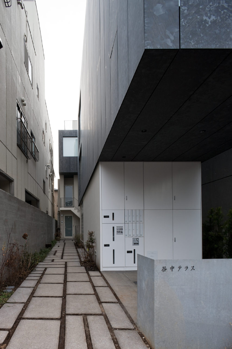 台東区谷中、言問通りに面した長屋形式9戸のコーポラティブ住宅。計画前そこには大正期の屋敷が建っていた。戦災による延焼を免れたこの地域の資産とも言えそうな母屋に加え、蔵や石畳、祠や石灯籠、古井戸などには、まるで時間が吸着しているかのように感じられ、それは谷中の町に対して自分が抱く質感そのものだった。「谷根千」と呼ばれるこの地域が散策の対象として人気を博す要因も、あるいは谷中に住むことを決めた9組のコーポラティブ参加者の動機も、この町の質感に依るものと考えて間違いない。それを再確認し、茫漠としたそのイメージをより具体的な建築設計に取り込むために、入居者と設計担当者達を対象にした計5回のワークショップを実施した。町の歴史をつかみ、この地域に特徴的な路地を歩きそのスケール感を味わい、地域固有の色や素材を見つけ、それらを際立たせる照明手法などを探った。一連のワークショップを通じて、建築は“自分達のものであると同時に地域に共有されるものでもある”という認識を共有できたように思う。この谷中テラスも、いづれ地域の資産と呼ばれ、町の質感を高めるような建築へ醸成し欲しいと願う。