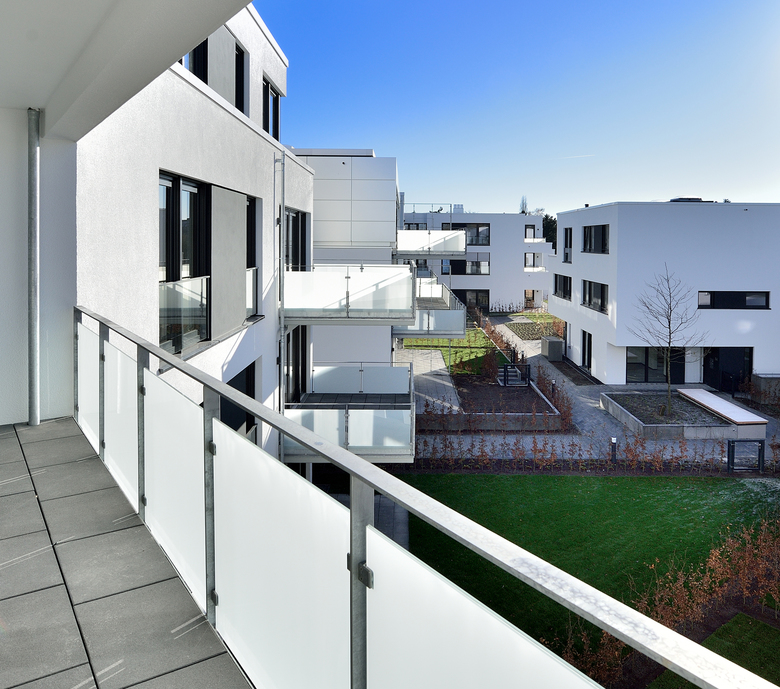 Die dreigeschossigen Gebäude mit zurückgesetzten Staffelgeschossen und großzügigen Balkonen, Loggien und Dachterrassen weisen eine reduzierte, klar ablesbare Architektursprache auf. Die anthrazitfarbenen Fenster mit außenliegenden Sonnenschutz bilden dabei einen spannenden Kontrast zur weiß verputzten Fassade.