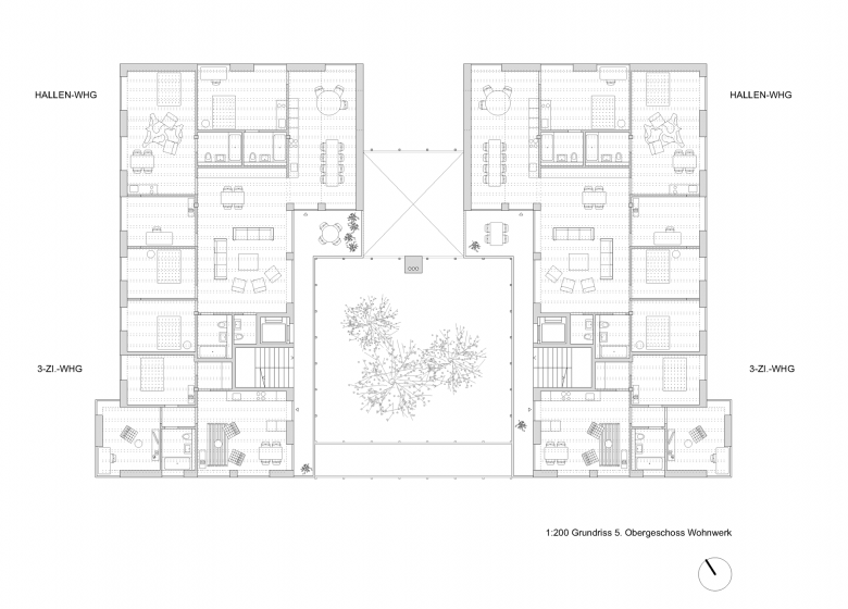 Die räumlichen Eingriffe in der Industriestrasse 9 werden so zurückhaltend wie möglich vorgeschlagen. Die Struktur wird erhalten, die Einbauten werden teilweise ausgeräumt und nichttragende Wände verschoben. Der bestehende Liftschacht wird bis ins Dachgeschoss verlängert und der Lift erhält durch den Teilabbruch der Rampe an der Industriestrasse einen ebenerdigen, behindertengerechten Zugang. Der Konzertraum im Untergeschoss bleibt, wo er ist, die Bar wird zugunsten der neuen WC-Anlage umdisponiert. Die Treppe hinter der Bühne verbindet den Konzertraum mit dem Gemeinschaftsraum im Hochparterre und dient als zweiter Fluchtweg. Das bestehende Treppenhaus mit Zugang zu den Ateliers und zur Grosswohnung kann so bei Grossanlässen im Konzertraum entlastet werden. Im Obergeschoss finden frei unterteilbare Ateliers Platz. Das Dachgeschoss erhält einen grosszügigen angeordneten Wohnraum mit einer grossen Dachverglasung im zentralen Bereich. Die Individualräume begleiten den gemeinsamen Wohnraum auf beiden Seiten. Der Rossstall erhält eine bauliche Erweiterung. Das Satteldach wird zugunsten einer Aufstockung rückgebaut. Im Erdgeschoss wird der bestehende Mittagstisch durch einen Quartierladen ergänzt. Im 1. Obergeschoss wird die vorhandene Wohnung erhalten und vergrössert. Ein Jokerzimmer und eine Dreieinhalbzimmerwohnung kommen hinzu. Im zweiten Obergeschoss ist die Gästepension des Wohnwerks untergebracht, in den darüberliegenden Geschossen befinden sich weitere Wohnungen und Wohnateliers.