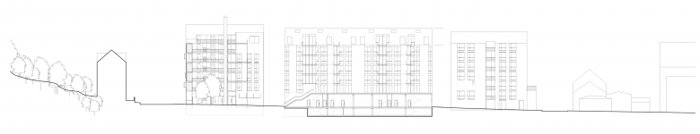 Wogeno und LBG sind auf dem Baufeld 2 an ruhiger, innenliegender Lage untergebracht. Zwei Zeilen - 10 und 14.30 Meter tief nehmen verschiedenen Wohnungstypen auf: Im schmalen Haus befinden sich die kleineren 3 ½- bis 4 ½-Zimmerwohnungen, im tieferen Gebäude die grösseren 5 ½- bis 6 ½-Zimmerwohnungen. Sowohl Wogeno als auch LBG besitzen Wohnungen in beiden Zeilen. Die effizienten vier- und fünfspännigen, zwischen den beiden Zeilen angeordneten Erschliessungen der Wogeno und der LBG funktionieren getrennt voneinander, könnten aber auch zusammengeschlossen werden. Die Erschliessungen führen jeweils zu privaten Terrassen, die der jeweiligen Wohnung vorgelagert sind und einen Übergang zwischen halböffentlicher Erschliessung und privatem Wohnbereich schaffen. Im EG sind sich in der östlichen Zeile der Kindergarten und die Kindertagesstätte mit begrüntem Aussenraum untergebracht. In der westlichen Zeile befinden sich zur Gasse hin Gewerbenutzungen. Zwischen den beiden Zeilen befindet sich im Erdgeschoss eine Veloeinstellhalle und im Untergeschoss findet die Parkgarage Platz.