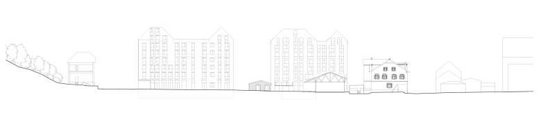 Während das Baufeld 1 mit der Industriestrasse 9 weitgehend durch den Bestand der Häuser und des Gartenhofs bestimmt wird, definieren die vier weiteren Baufelder zusammen ein neues Gassen- und Strassensystem in einer kreuzförmigen Anordnung. Die Achse in Ost-West-Richtung ist dabei versetzt angeordnet, jene in Nord-Süd-Richtung erfährt im Innern des Areals eine platzartige Ausweitung. Damit wird Linearität unterlaufen: Die räumliche Vielfalt innerhalb des Areals wird betont und es entstehen überraschende ‚Blicke ums Eck'. Die Durchwegung des Areals und die Vernetzung mit dem umliegenden Quartier folgt dieser Idee und schafft eher informelle Verbindungen im Sinne von ‚Schleichwegen' und ‚Durchschlupfen'.