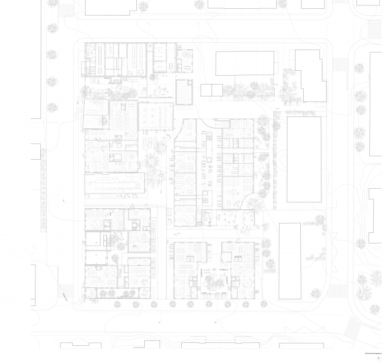 Die Neubauten orientieren sich in der Grösse des Footprints an den umliegenden Gebäuden des Quartiers. Die geforderte sechsgeschossige Bauweise übersteigt jedoch die Höhe der meisten Nachbargebäude und könnte sowohl zu diesen als auch arealintern zu einer allzu hohen Dichte führen. 1:500 Umgebung mit Dachaufsichten, genordet Kooperation Industriestrasse Luzern P H O E N I X Hier kommen die niedrigen Bestandesbauten zu Hilfe. Sie schaffen auf Erdgeschossebene einerseits eine klare Definition der Gassenräume. Darüber hinaus schaffen sie jedoch Luft und Licht für die darüberliegenden Geschosse. Sämtliche Gassenräume sind nicht unterbaut, eine ideale Voraussetzung für einzelne grosskronige Bäume, welche das Mikroklima positiv beeinflussen. Die Setzung dieser Einzelbäume erfolgt präzise, sei es an einer Gassenkreuzung oder auf dem Platz vor dem ausladenden Dach des ehemaligen Eisenwarenhandels. Die Befestigung der Gassen ist in Drain-Asphalt vorgesehen, der einerseits sickerfähig ist, andererseits eine für verschiedenste Nutzungen brauchbare Oberfläche bereitstellt.