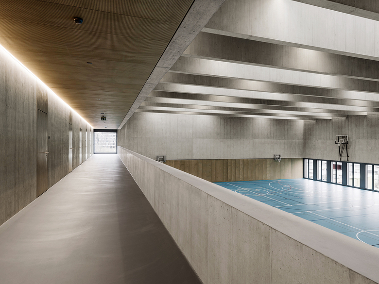 Die Eingangshalle mit dem opulenten Wandbild, die zweigeschossige, rundum verglaste Mensa mit dem abstrahierten Blätterdach, die ganz mit Holz ausgekleidete Aula und die Mehrzweckhalle mit der offenen Zuschauergalerie aus Sichtbeton bilden differenzierte Höhepunkte.
