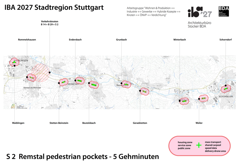 Auf den Teilbrachen an den S-Bahnhöfen und auf den Geleisgeländen können architektonische Knotenpunkte verdichtet werden. So dienen die bestehenden Nahverkehrsbahnhöfe der Verdichtung und dem beschleunigten Verkehr von Personen, Daten und Waren. + + + Beschleunigung zur Entschleunigung.