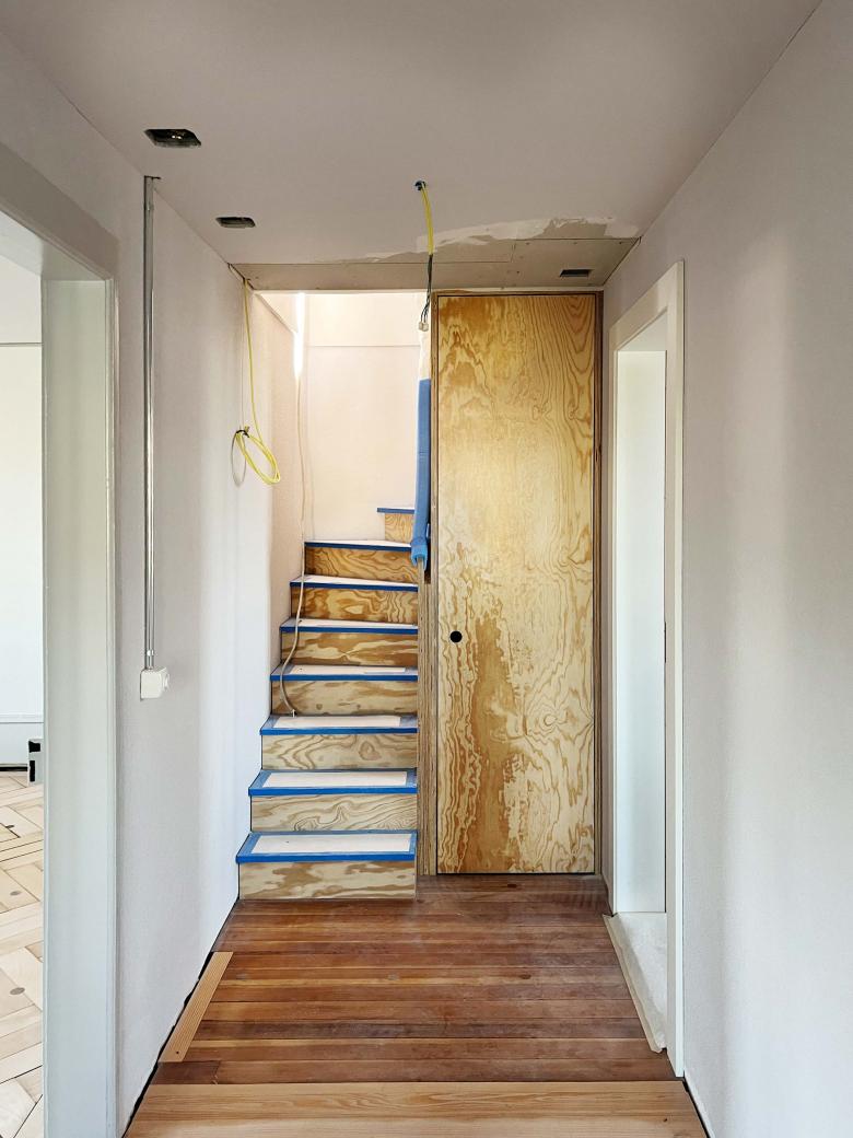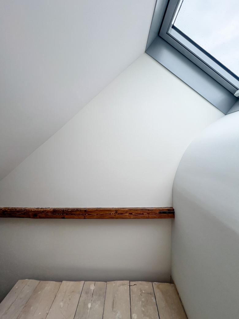 Das charakterstarke bestehende Treppenhaus wird zur wohnungsinternen Erschliessung der geschossübergreifenden Grosswohnung. Durch die Entfernung der ehemaligen Wohnungstüren und Trennwände zwischen dem Treppenhaus und den Wohnungskorridoren entsteht ein grosser räumlicher und atmosphärischer Gewinn. Mit dem neuen Dachfenster über der Treppe wird die Originalsubstanz noch besser zur Geltung gebracht.