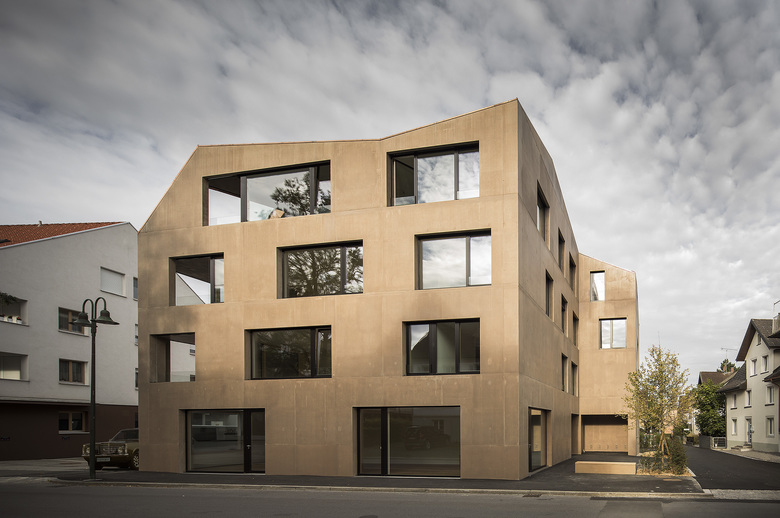 Umso schwieriger das Grundstück, desto kreativer die Lösung. Das nennt man eine Herausforderung. Nicht die einzige. Eine andere, als Vorgabe der Stadt formuliert: Umsetzung einer modernen Interpretation eines Satteldachs als unmittelbarer Typologiebezug zur Architektur der Nachbarschaft. So gesehen wird das Satteldach in verschiedenen Schnittformen zum Maßstab - für die Baukörperteilung und für die Wohnungsaufteilung. Die individuelle Gestaltungsfreiheit bekommt in den 13 Wohneinheiten in der Wohnanlage mehr Spielraum für eine höhere Wohnqualität. Zu den unverrückbaren Fixpunkten der Wohnanlage zählen Kochnische und Bad, alles andere ist für Wünsche der Bewohner noch offen. Das variantenreiche Spiel mit den Fenstern und deren überraschende Anordnung werden zu einem Merkmal des dreigeschossigen Gebäudes. Die Fassade ist Sichtbeton, der eine leichte Farblasur erhält, die die Betonstruktur durchschimmern lässt – Schutz und Farbakzent zugleich.