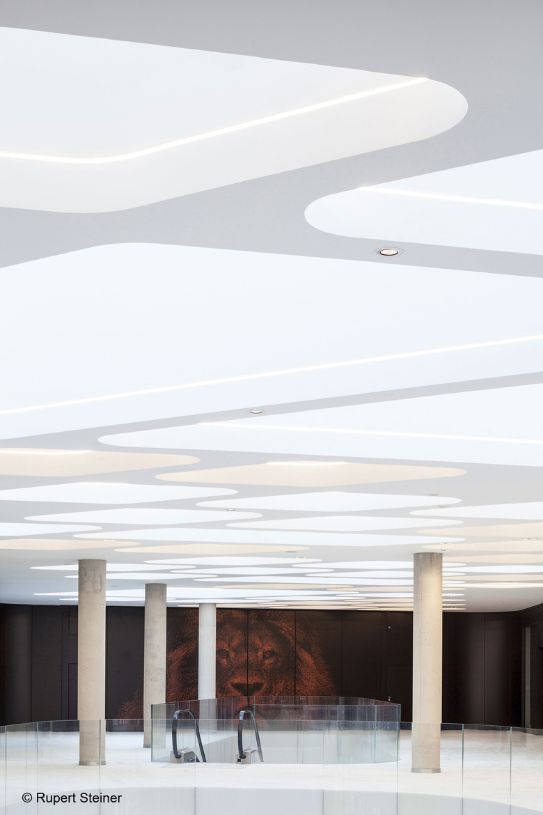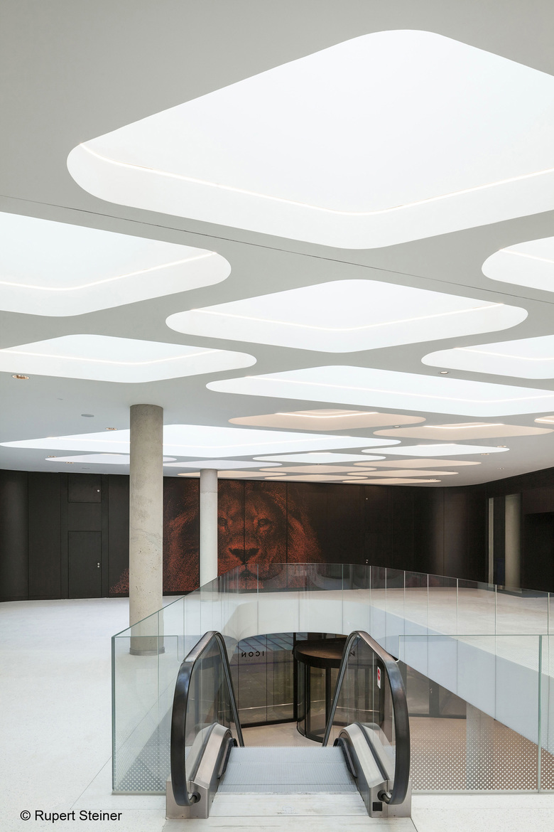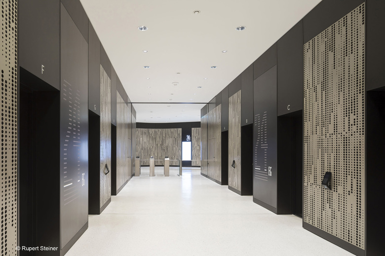 The bustling plinth combines the three towers on the ground floor as well as the first basement floor and the first floor. It acts as a large public space giving tenants access to a variety of shopping and catering areas. At the same time, it connects the towers with the neighbouring facilities, and opens up the site towards Vienna Central Station (Hauptbahnhof), allowing direct access to the train station and public transport services of Vienna’s underground and urban line networks.