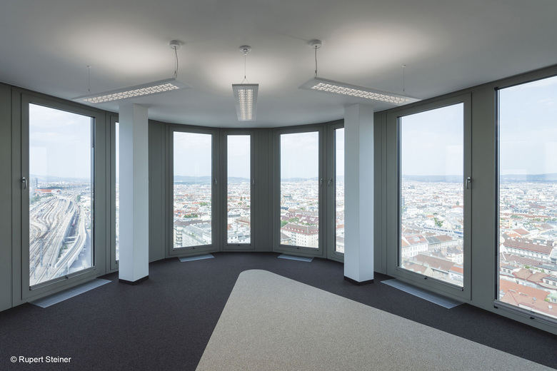Behind a generous glass facade, high quality office spaces for about 5,700 employees have been created on approximately 87,000 square metres of rental space. Thanks to their exceptional flexibility and the optimum use of space, the buildings are suited to various uses and office layouts precisely to tenants’ needs, be it open plan or closed offices. The three office towers provide breathtaking, panoramic views of the city of Vienna through the floor-to-ceiling windows. The tallest of the towers reaches a height of 88 metres.