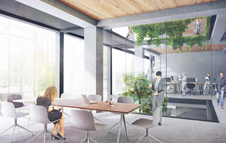 Die Fassade ist sowohl stadträumlich als auch technisch ein dialogisches Bindeglied zwischen den Ansprüchen der Umgebung und den innenräumlichen Komfortanforderungen. Denn das Gebäude exponiert sich zu zwei stark befahrenen Straßen im Süden und Westen. Auf die daraus resultierenden Anforderungen hinsichtlich des Schallschutzes und sommerlichen Wärmeschutzes wird mittels der vorgestellten zweiten Gebäudeschicht reagiert. Wintergärten und Doppelfassaden schaffen bauklimatische Pufferzonen. Terrassen, Treppen und Bepflanzungen bieten Verschattung.