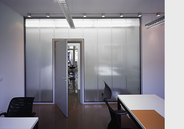 Der Grundriss basiert auf einer dreibündigen Anordnung basierend auf der übergroßen Tiefe des Gebäudes. Somit wurde Raum geschaffen für den Empfang und möglichen Seminaren im Mitteltrakt der Räumlichkeit. Damit natürliches Licht auch dort Einlass findet, wurde eine Bürowand in transluzenten Polykarbonatdoppelstegplatten konstruiert.