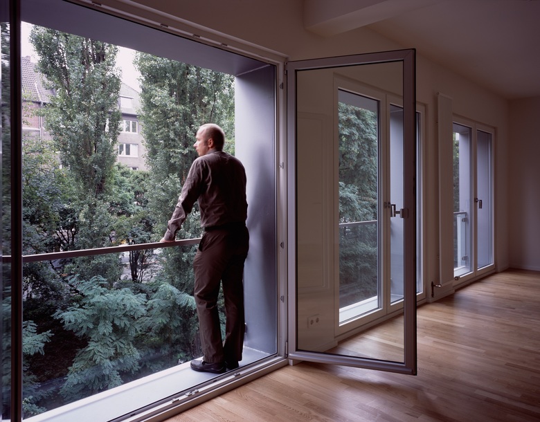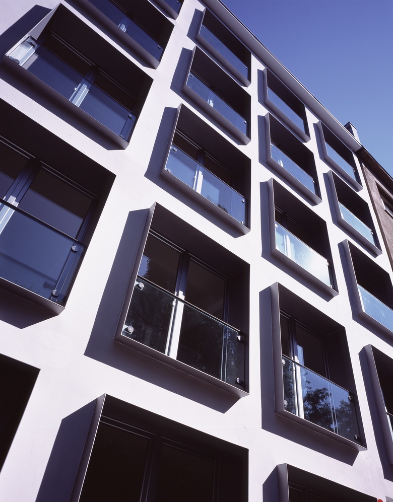 Eine Stahlzarge als Französischer Balkon verleiht einer schlichten und ebenen Blockrandbebauung ein neues und dreidimensionales Gesicht und den Bewohnern eine schöne Austrittsmöglichkeit in die Sonne.