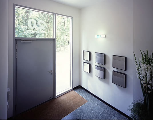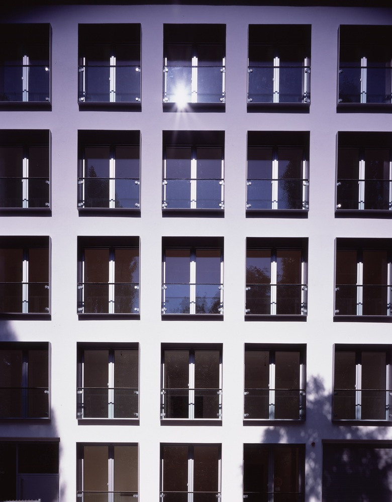 Da die Balkone sich auf der Nordseite des Hauses befinden, wurde eine Kompensationsmassnahme in Form von groß bemessenen Stahlzargen, die 15 cm aus dem Gebäude herausragen und innen angeschlagene Fenster aufweisen, für die balkonlose der Strasse zugewandten Südfassade entworfen. Diese bieten für einen Austritt Platz und haben als äußeren Abschluss eine gläserne Brüstung. Somit wird dem Grün der Alleestrasse und dem Licht in die großen Wohn- und Essbereiche ungehindert Einlass gewährt.