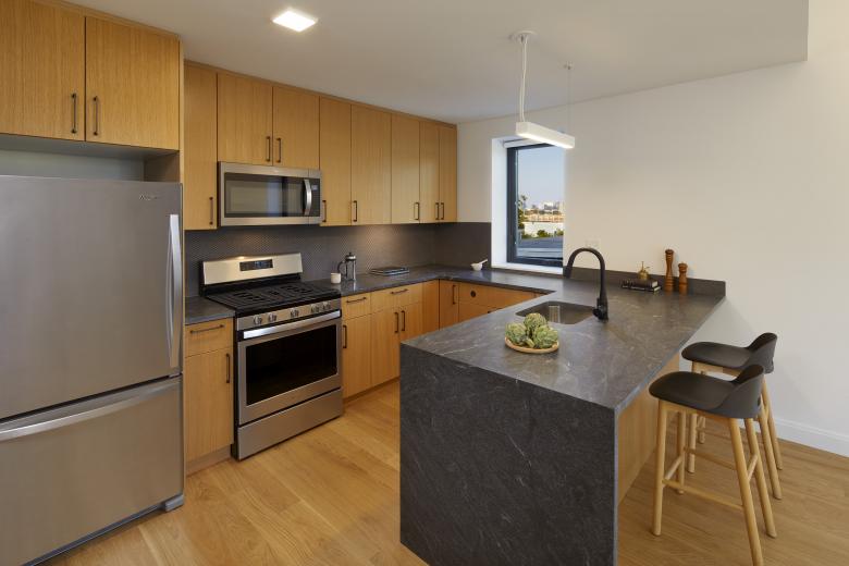 83 Gardner Street is a four-story, 38-unit apartment building in Allston. The project is the first phase of Packard Crossing, a residential development owned by The Hamilton Company that provides moderately-priced housing for the community, creates new connections in green spaces, and unifies the surrounding neighborhood. 83 Gardner includes the preservation and restoration of one of the last remaining Victorian-era houses on Gardner Street. The restored porch and ground floor lobby/lounge serves as a threshold to connect the historic structure to new construction, building upon the existing massing and rhythm of its residential street. Working in collaboration with Ground, Inc., the project preserves existing trees in a newly designed courtyard. 83 Gardner Street is LEED Silver Certified. Drone view provided by Odeh Engineers.