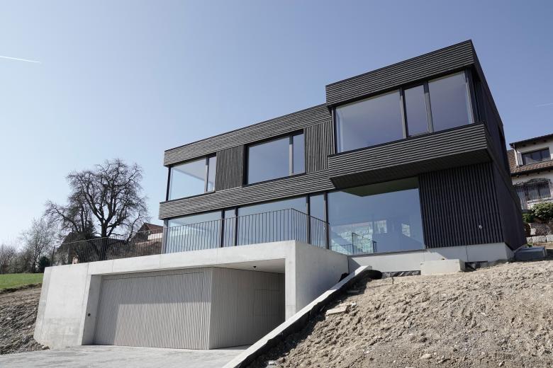 Dem harten und hellen Sockel steht die dunkle Holzfassade gegenüber, welche mit einem Spiel aus vertikal und horizontal angelegten Bereichen dem Haus eine textile Wirkung verleiht.