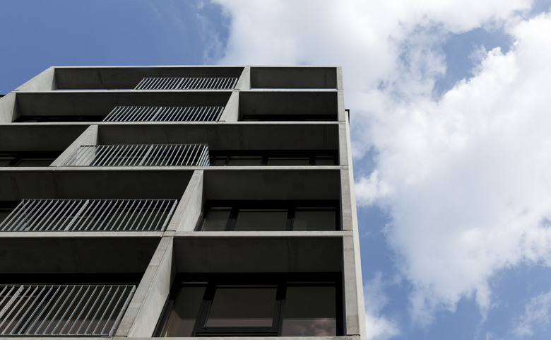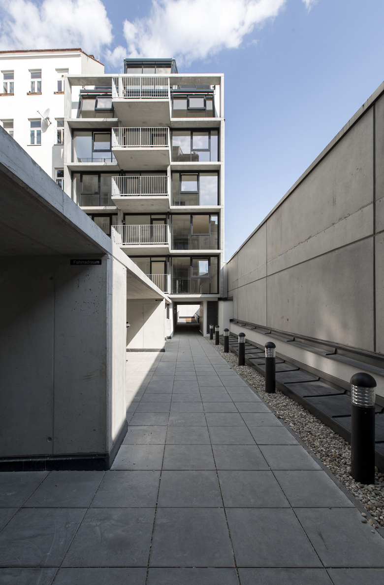 Auf einem langen, schmalen Grundstück im fünften Wiener Bezirk schließt der zweiteilige Wohnbau eine städtebauliche Lücke. Blickfang der beiden Wohnhäuser sind die transparenten Fassaden. Der wohlproportionierte Rahmen aus Stahlbeton mit raumhohen Fenstern bringt viel Tageslicht in die Tiefe der Räume.