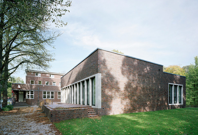 Die Erweiterung basiert folgerichtig auf dem Entwurfsansatz Schumachers, nämlich den Neubau in unterschiedlich proportionierte Baukörper zu gliedern, die der darin vorgesehenen Funktion folgen. Das Foyer wird weit zurückliegend angeordnet und an das historische Gebäude angeschlossen. Ein als Terrasse nutzbarer Eingangshof wird als Zone zwischen Alt- und Neubau angeordnet, sodass der neue Saal zwar freigestellt wird, sich gegenüber dem Bestand aber weiterhin zurückhält. Dabei wird die Hierarchie von Alt und Neu nie infrage gestellt, zusammen mit den Freiflächen entsteht ein ausgewogenes Ensemble von hoher räumlicher Qualität.