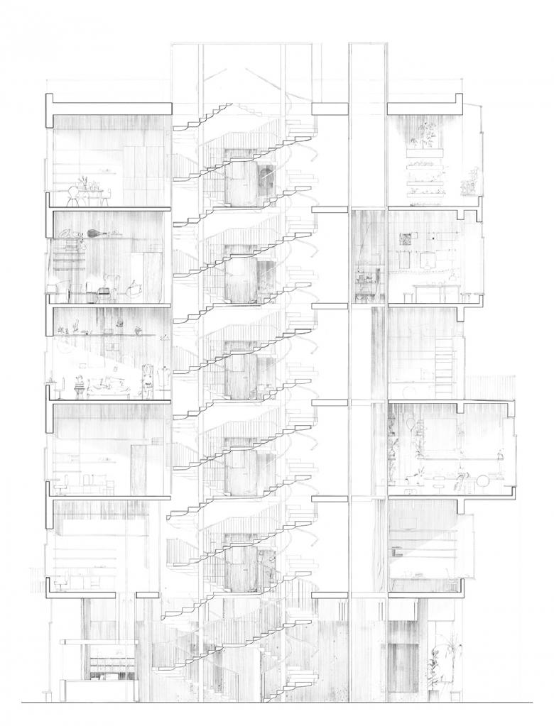 The project tackles three challenges in society. The first one is the ageing population. The second is the reduction of energy consumption per square meter, while increasing the amount of the square meters per person. Last but not least, the challenge quoted by Zygmunt Bauman “in the end of independence there is emptiness of life. Independence should be replaced with very pleasurable interdependency”. All of those challenges have inspired solutions, that are used in the building. Firstly, the apartments, easily turn into shared nurseries. These are accessible by inclusive stairs which are convenient for very young as well as elderly habitants. Month, years and decades of domestic life are shown in the drawing “Notion of time”. It is a design tool helping to visualise how the building might evolve in time, reflecting the needs of the inhabitants. One important aspect of the design is flexibility, allowing the users to personalise their home and makes it convenient throughout life. Secondly, to design smaller apartments with the same quality, the housing association and the units need to host some of the secondary functions. Many common spaces have been designed, including the laundry room. They are linked to universal activities and rituals for different generations and cultures, like washing, eating and crafting. The layout of the laundry room provides a hanging/drying racks over the full 4,5 meter height of the space. Windows on both sides of the room provide natural ventilation. During the washing itself you can iron, sew a sock, have a chit-chat and keep an eye on the playing children. It is a public space, but the residents of the building can use the laundry shafts to bring their cloths to their apartments. All those spaces are designed to subconsciously encourage a person to engage with the community. The building hosts individuals living together, in the precious interdependency of a contemporary community. The project combines contemporary sustainable solutions, with the open community that is present in human culture for hundreds of years.