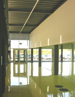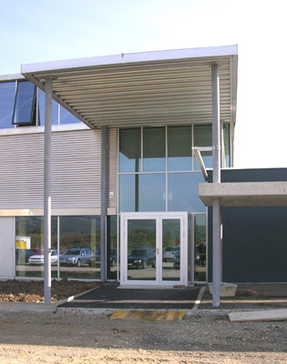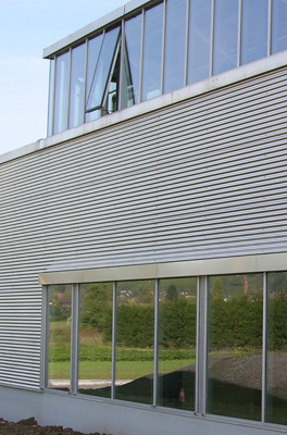 Produktion mit bläulichem Glas und Aluminiumverkleidung, Lager mit geschlossener Aluminiumverkleidung, Bürogebäude dunkelblau verputzt und Verbindungsstrasse voll verglast. Das Nebeneinander wird mit einer Schichtung von geschlossenen und verglasten Flächen und von präzisen, horizontalen Abdeckbändern zu einem Ganzen verbunden. Zusammen ergibt sich ein harmonischer Farb- und Materialklang. Der durchgehende zitronengelbe Kunststoffboden schafft einen wohltuenden Kontrast zur kühlen, äusseren Erscheinung des Gebäudes und reflektiert das Licht als Warmton auf Wände und Decken.
