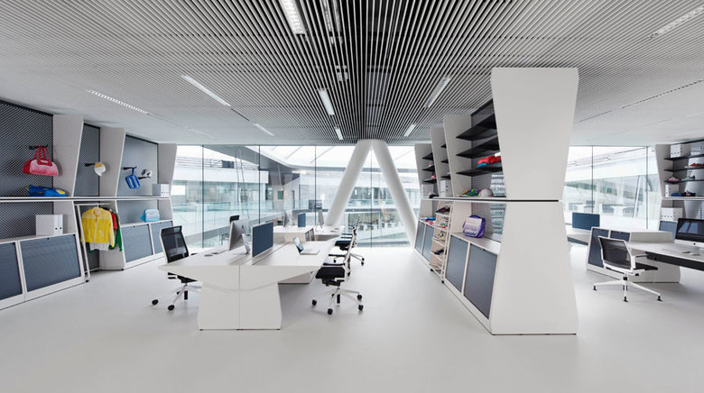 Kinzo entwickelt für adidas ein Raum- und Möbelprogramm, das höchste funktionale Ansprüche mit der spektakulären laces-Architektur von kadawittfeld vereint. Das Möbeldesign greift die kommunikative Architektursprache auf und vervollständigt den Bürokomplex zu einem beeindruckenden Erlebnis mit der ästhetischen Qualität und Kontinuität eines Filmsets – als sei die Möblierung Teil der Architektur oder die Architektur Teil der Möblierung. Das Sortiment aus knapp 50 Teilen ermöglicht zahlreiche Raum-Funktions-Varianten. Und am Ende garantieren umweltschonend pulverbeschichtete Oberflächen eine innovative Wertigkeit, die das Design zusätzlich veredeln.