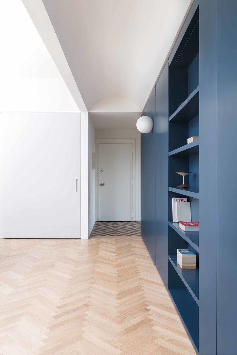 Le pareti contrapposte alle numerose finestre sono la cornice che ospita la storia della nuova famiglia: gli oggetti che abitano le mensole nella parete e l'intenso colore blu caratterizzano fortemente lo spazio.