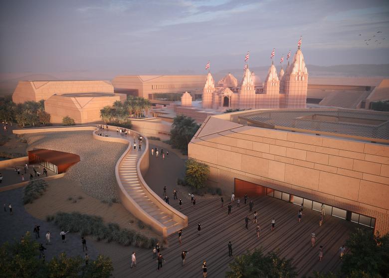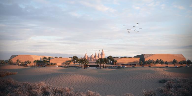 The BAPS Hindu Mandir complex brings together Indian heritage and Middle Eastern context. While the temple celebrates centuries-old Hindu craftsmanship, the surrounding architecture responds sensitively to the desert climate and regional culture.