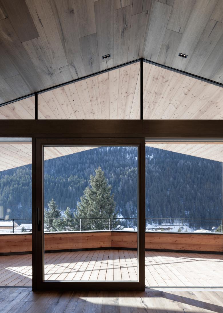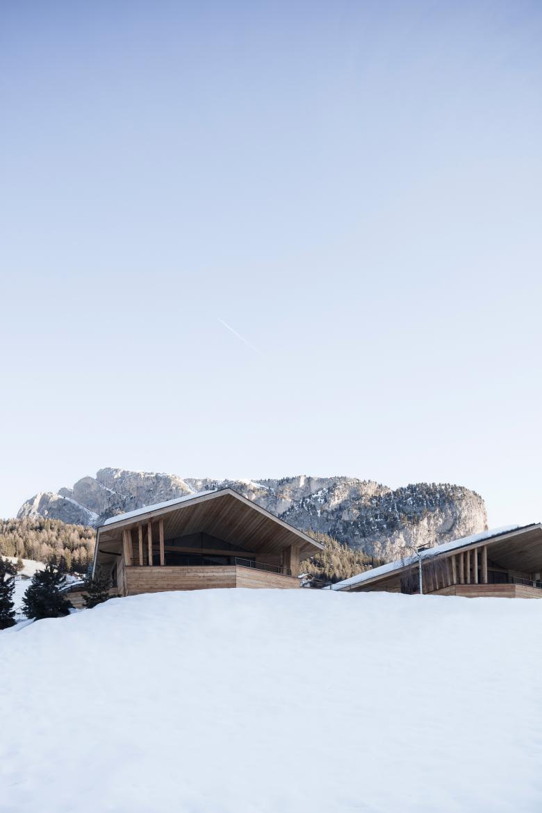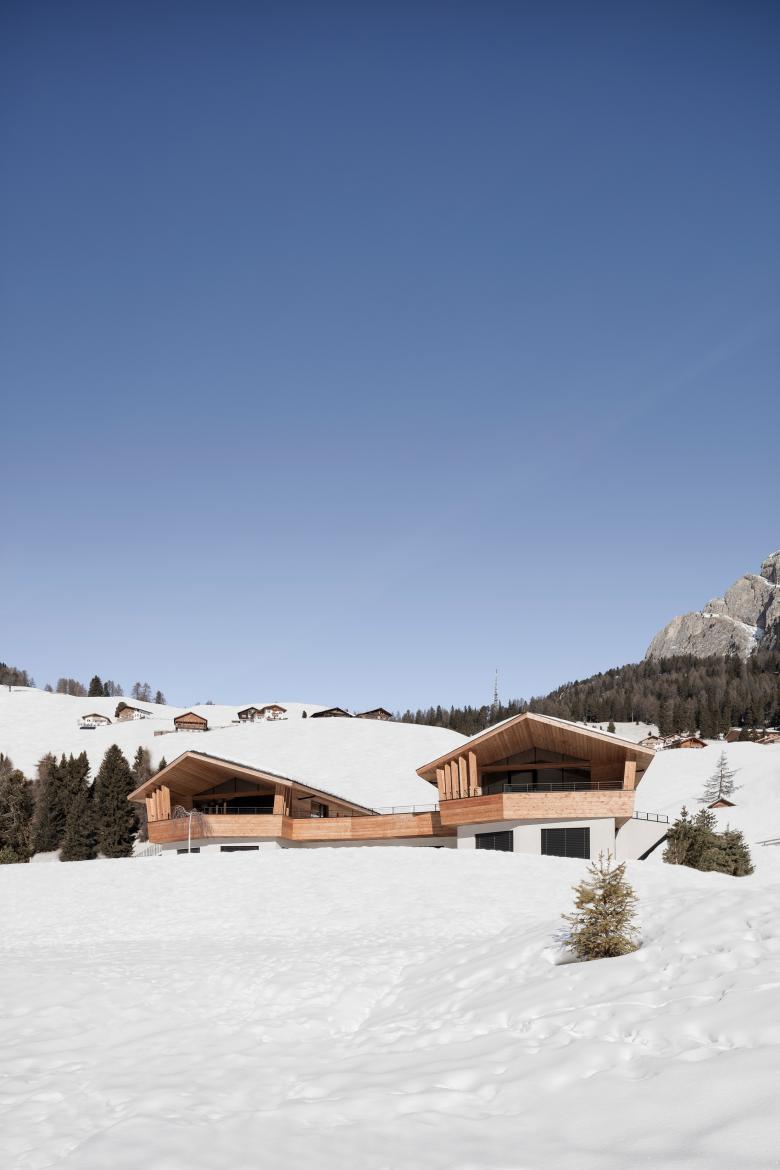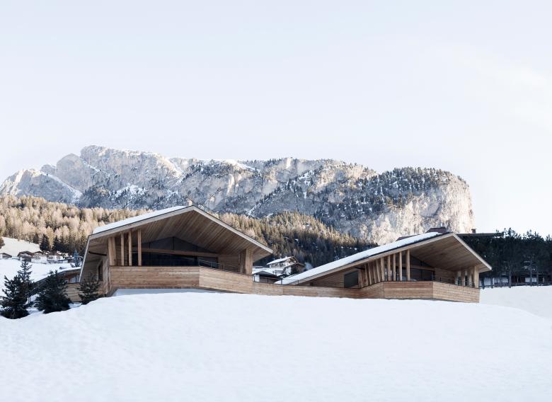 The private homes are located on a sloping plot in Selva, which - situated in the heart of the South Tyrolean Dolomites - forms the end of the Val Gardena.