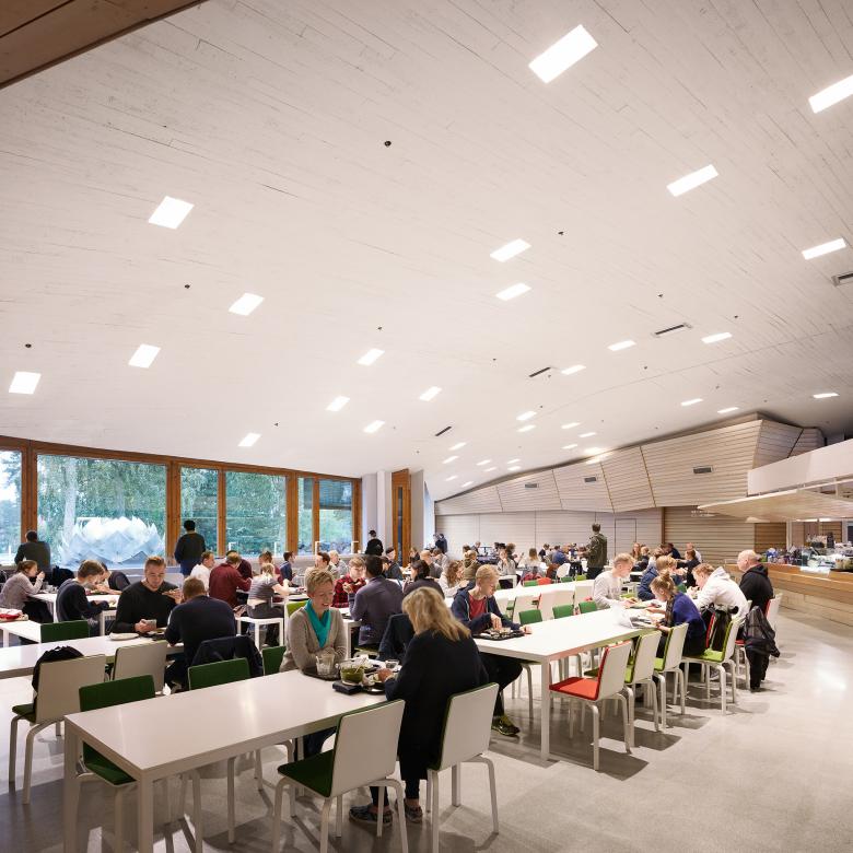 In its new role Dipoli functions as the meeting place for the university administration, the academic community, the students and other stake holders. All of these parties were also activated in the spatial re-design process that turned the building into a sustainable, flexible workspace of the future. In addition to housing the administration, Dipoli continues to function as a prime location for important lecture events, as well as university festivities, and acts as a display platform for the university’s research and design projects. The cafés and restaurants at Dipoli cater for students, staff, as well as neigborhood residents.