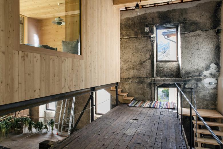 In einem für die Landwirtschaft nicht mehr benutzten Heustall steht auf dünnen Stahlstützen ein neuer, heller und beheizbarer Raum aus Fichten- und Lärchenholz.