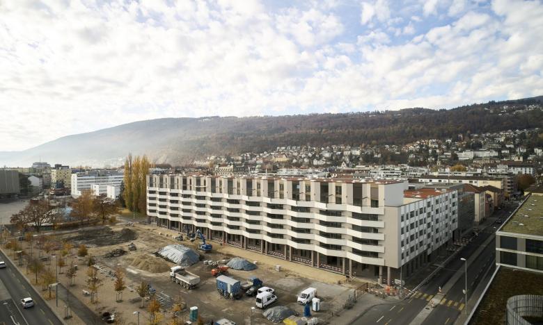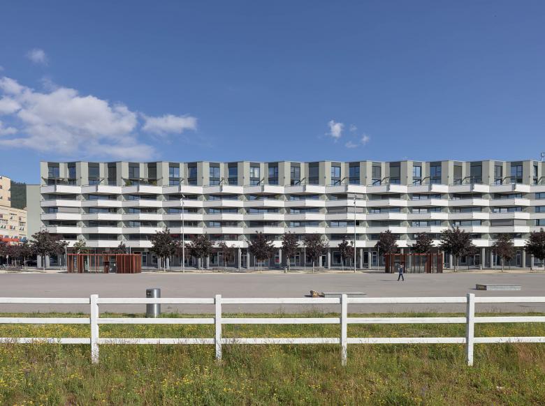 Das Projekt Biel Esplanade Nord auf dem ehe­ma­li­gen Gas­werk­are­al in Biel säumt in un­mit­tel­ba­rer Zen­trums­nä­he einen be­deu­ten­den, städ­ti­schen Freiraum / Auftakt zum lang­ge­zo­ge­nen Platz bildet das prägnante Kon­gress­haus von Max Schlup aus dem Jahre 1966 / An der nörd­li­chen Längs­sei­te bildet das Projekt eine sie­ben­ge­schos­si­ge, ho­ri­zon­tal ge­schich­te­te, 300 Meter lange Stadt­front, welche durch gefaltete Bal­kon­log­gi­en eine spe­zi­fi­sche Identität ent­wi­ckelt / Die Arkade im hohen Erd­ge­schoss sowie die zwei­ge­schos­si­ge Aus­for­mu­lie­rung des Attikas verleihen der Süd­fas­sa­de eine span­nungs­vol­le Glie­de­rung / Un­ter­schied­lich aus­ge­rich­te­te und ge­stal­te­te Höfe prägen das Projekt im Inneren und er­mög­li­chen eine dif­fe­ren­zier­te Nutzung der Erd­ge­schos­se / Das Programm umfasst Wohnungen (Teil West und Ost) ein Hotel (Teil West), ein Al­ters­heim (Teil West) und diverse Erd­ge­schoss­nut­zun­gen mit Cafés und Läden.