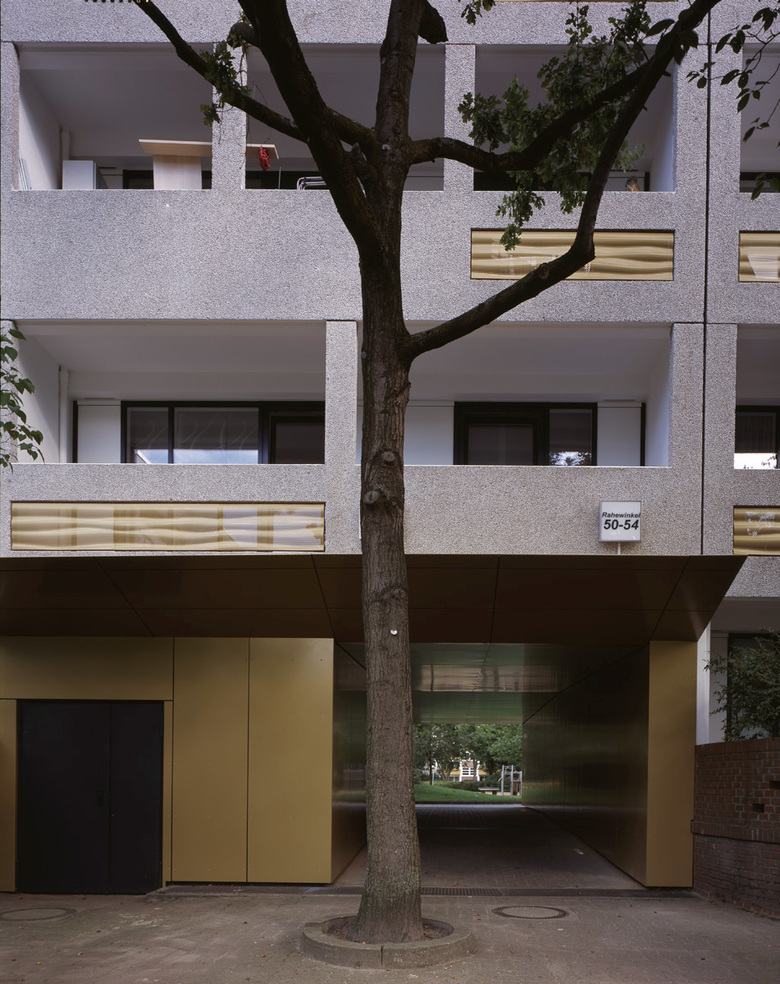 Die energetische Fassadensanierung der Gebäude der Baugenossenschaft Fluwog Nordmark eG, an den Straßenabschnitten Heideböck und Steinbeker-Grenzdamm, bekennt sich mit Respekt zu den Fertigteilkonstruktionen mit ihren klaren Linien, den abwechselnd gestalteten Bauabschnitten und den exzellent proportionierten Großformen. Klare geordnete Strukturen, eingewachsen in üppiges Grün, lassen den Menschen viel Platz, Licht und Außenraum. Selbst die Fertigteilblumenkästen vor den großzügigen Loggien schaffen eine aufgeräumte Ruhe und menschliche Ablesbarkeit.
