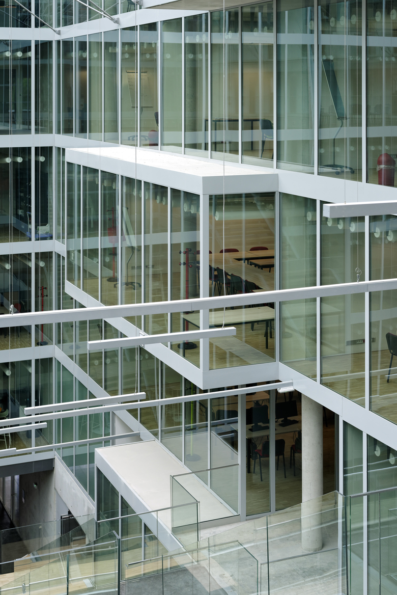 The offices are arranged around the atrium on five floors. Meeting rooms and open common areas animate the inner façade by providing bow windows into the court. There are large wooden terraces on each floor. These outdoor areas can be used for meetings, spontaneous and informal, as well as for moments of relaxation and rest.