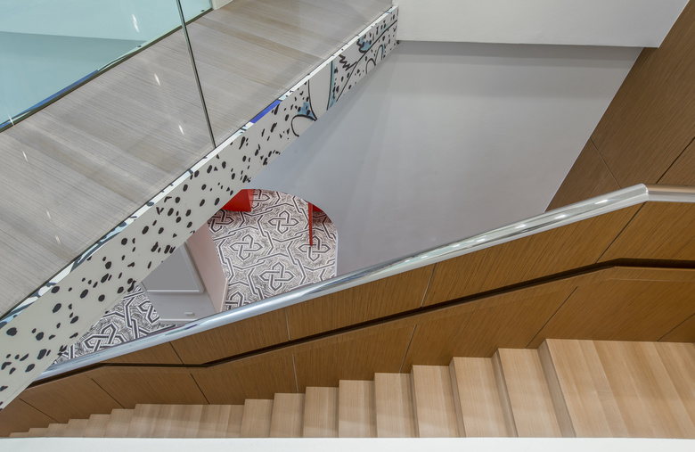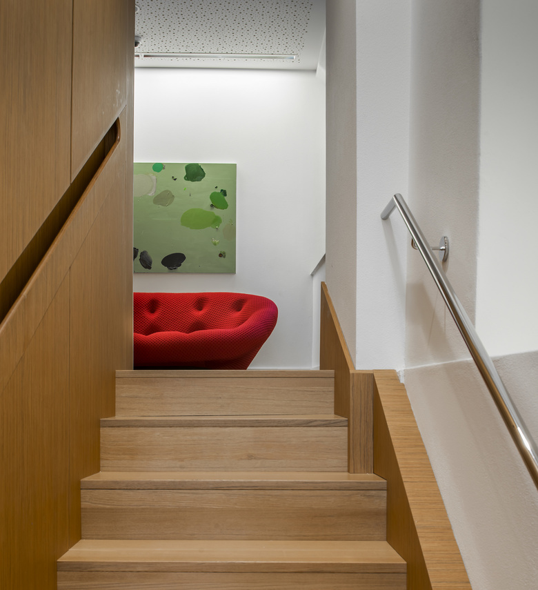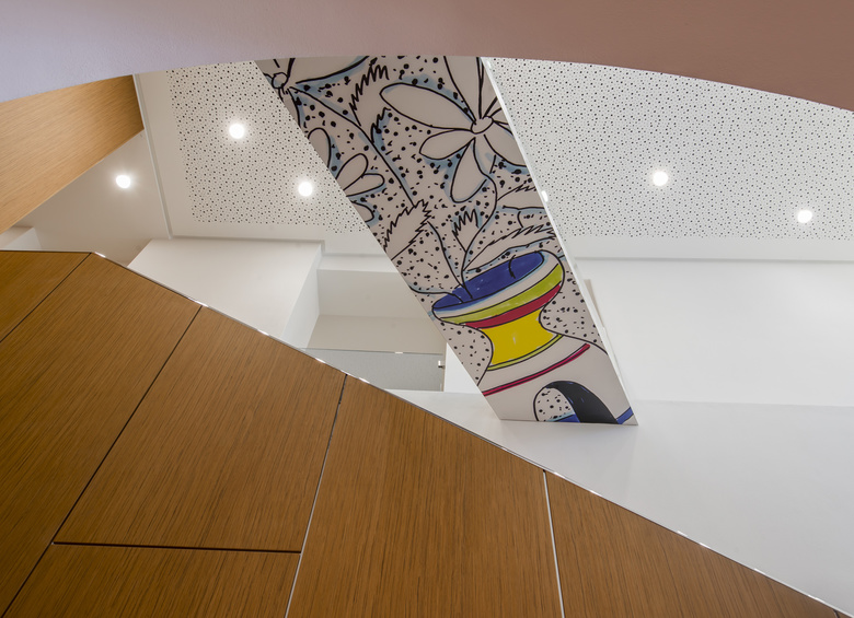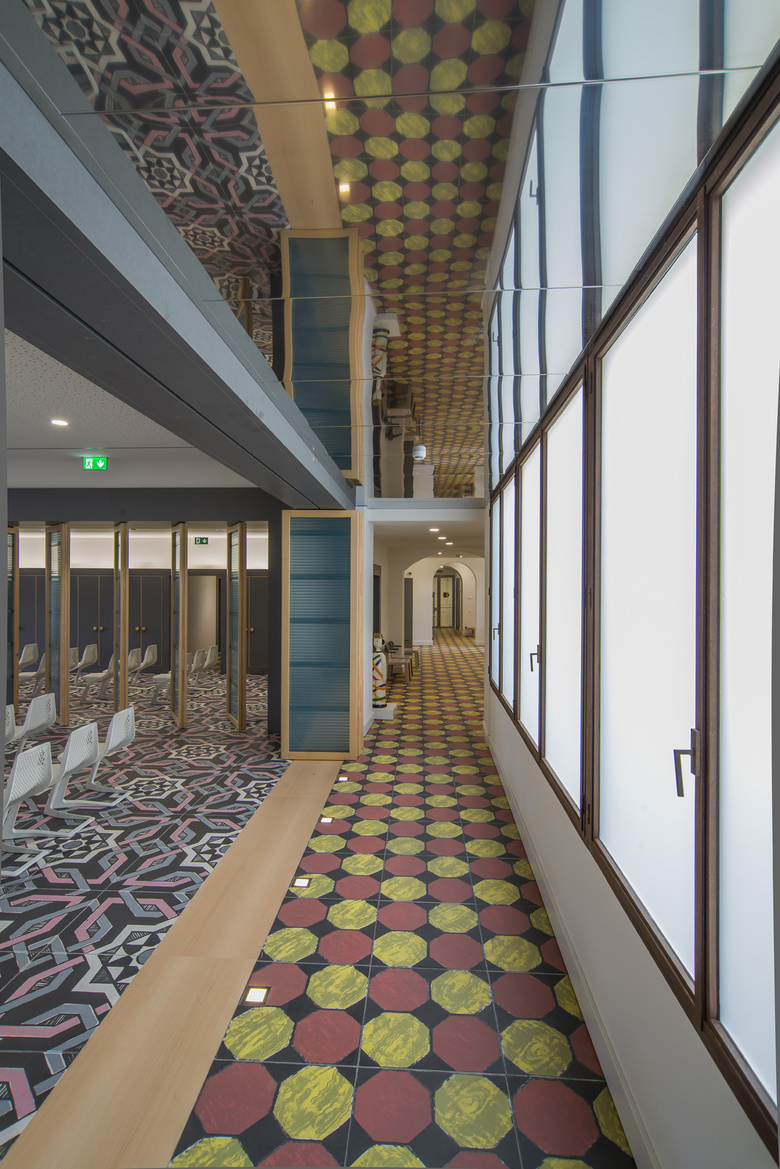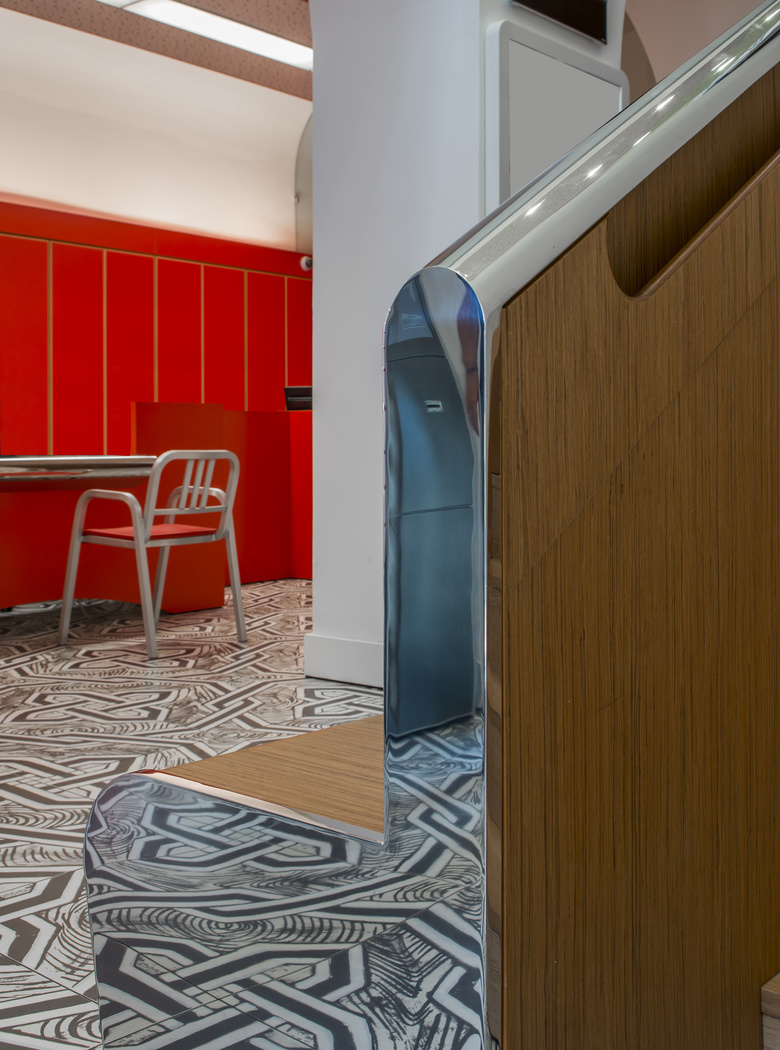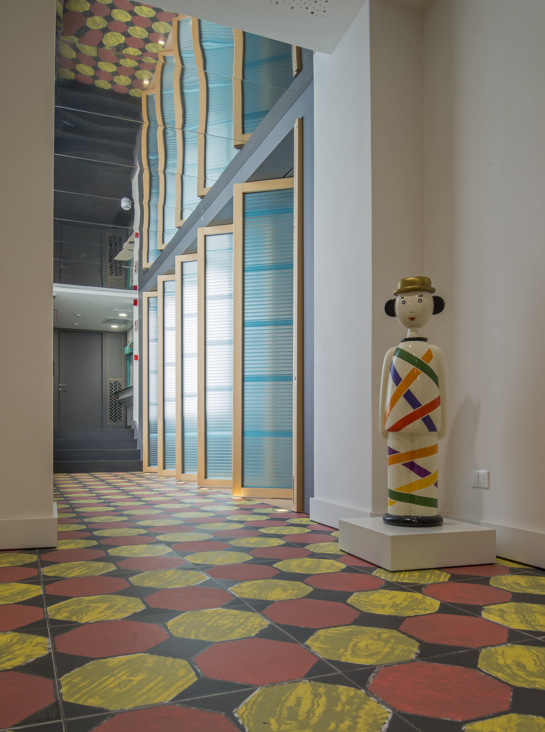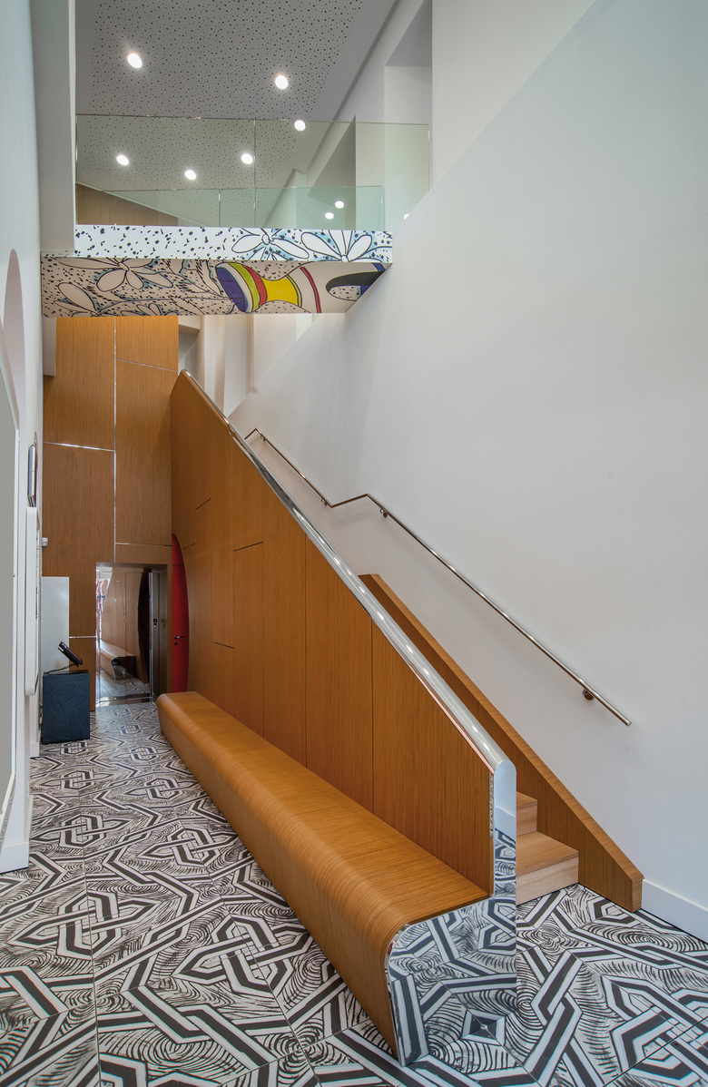 All’esterno l’edificio mantiene un aspetto omogeneo, quasi inalterato rispetto al “volto” regalatogli dalla storia e si integra con il resto dei prospetti affacciati sul fiume. All’interno il progetto ammicca ai decori tradizionali delle mattonelle in graniglia degli anni Cinquanta, ingigantiti attraverso la lente della rivisitazione pop. Così dove il pavimento prende colore gli arredi si fanno più tenui e misurati, al contrario nelle stanze in cui il rivestimento è bianco e nero gli armadi, i tavoli e le sedie si accendono con i colori intensi del rosso.